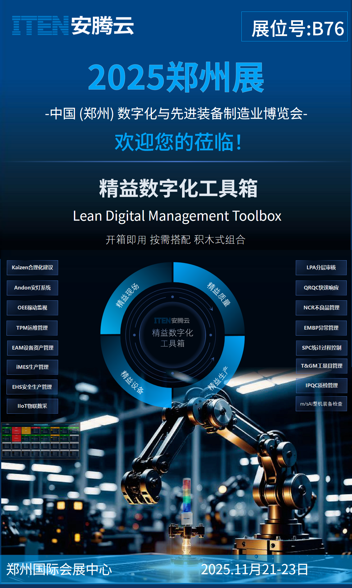 届时,作中国专业的精益数字化方案提供商,安腾云将展出以精益小灯塔为主的OEE稼动监视、Andon安灯系统、工场可视化等数十个精益数字化管理工具,与您携手探索智能制造精益数字化转型实践。方案场景展示位置安排在B76号。